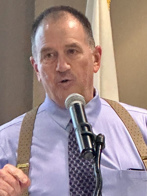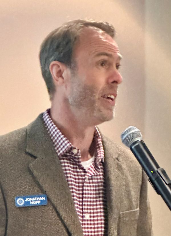 Greeter Jonathan Hubb told us about himself. He's been a member since 2023 and is pastor of Bluemont Church. He was married to Reagan who passed away 4½ years ago and has 3 sons and 2 daughters. Jonathan remarried Michelle 3 months ago, from Brazil that he met at KU.
