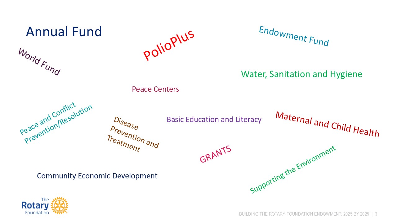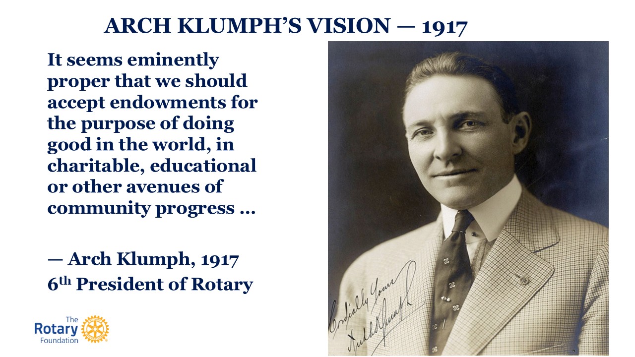 Roger presented The ABCs of the Rotary Foundation, explaining the purpose and impact of the Annual Fund, Endowment Fund, PolioPlus, District Grants, Global Grants, and more. It began with Arch Klump's vision in 1917 where the Kansas City club began with $24.50!