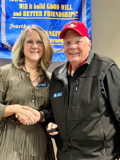 Liz Nelson presented a Paul Harris +3 Pin to Phil Mattox honoring his donations to the Rotary Foundation. I also announced that Bill Richter joined the Foundation's Polio Society and earned a pair of red Rotary socks!